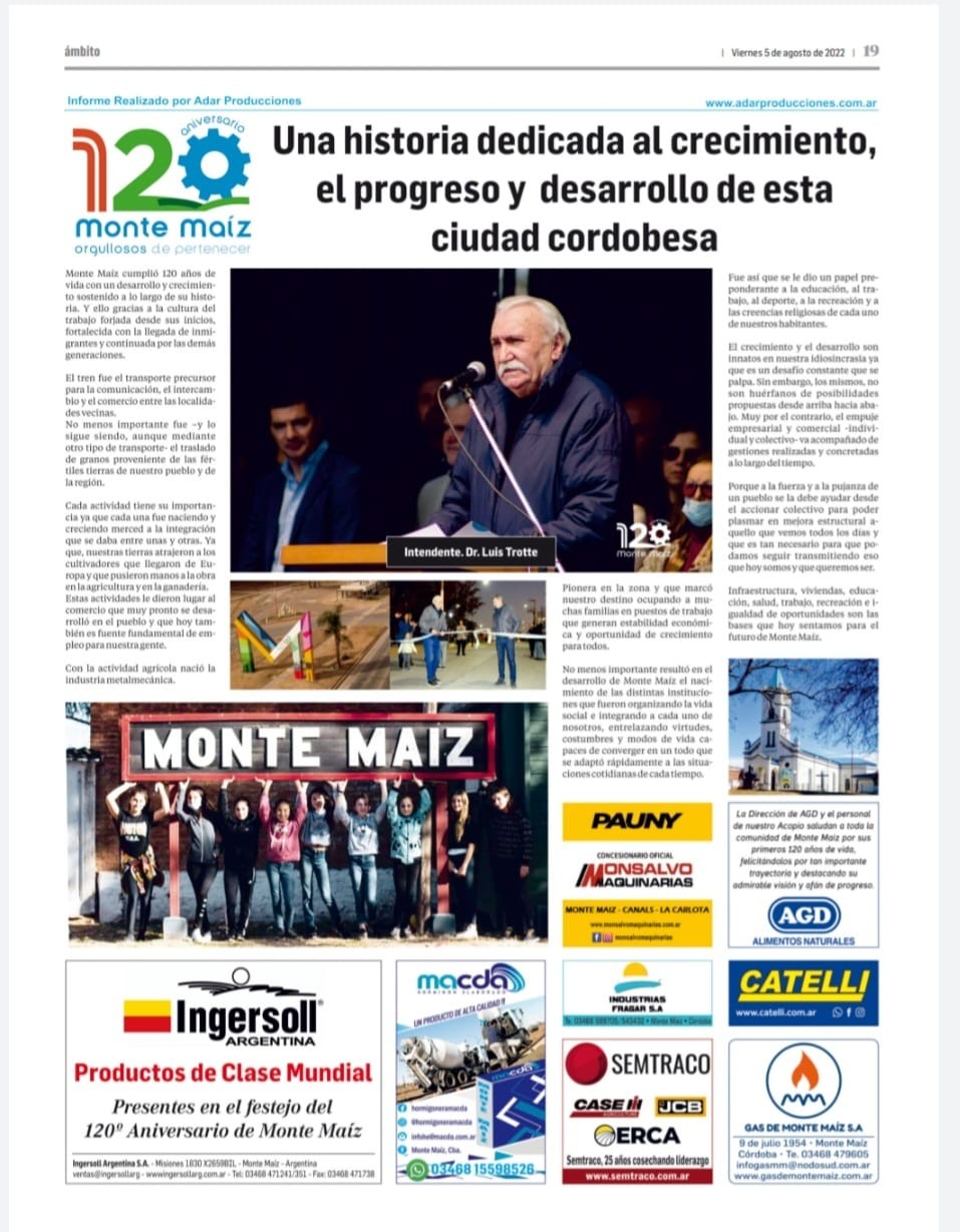 Monte Maíz cumplió 120 años de vida con un desarrollo y crecimiento sostenido a lo largo de su historia. Y ello gracias a la cultura del trabajo forjada desde sus inicios, fortalecida con la llegada de inmigrantes y continuada por las demás generaciones.