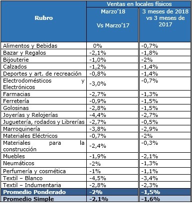 Las ventas minoristas de los comercios Pymes finalizaron marzo con una caída de 2% frente a igual mes del año pasado, medidas a precios constantes, y acumulan una baja anual de 1,5% en los primeros tres meses del año. Comparadas con febrero subieron 10%, incremento que se explica básicamente por cuestiones estacionales.