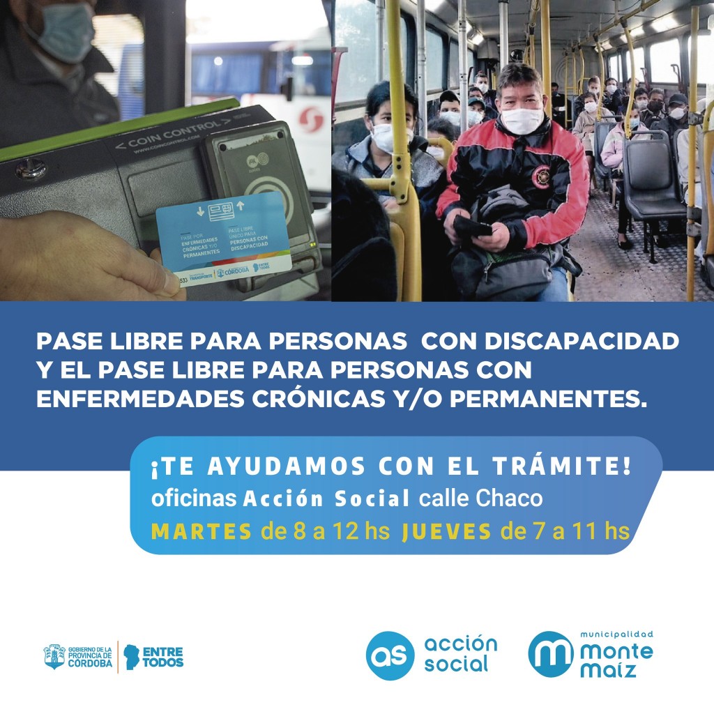 La oficina de Desarrollo Social informa a la población que se podrá realizar el trámite para la obtención del pase libre -para viajar gratos en el transporte interurbano de pasajeros- para todas aquellas personas con discapacidad o que padezcan enfermedades crónicas y/o permanentes.