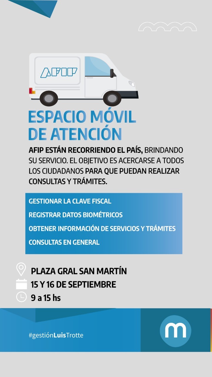 El jueves 15 y el viernes 16 de setiembre estará en Monte Maíz el Espacio Móvil de la AFIP. Se atenderán trámites tales como: Gestión de Clave Fiscal; Registro de datos biométricos; obtención de información de servicios y trámites y consultas en general.