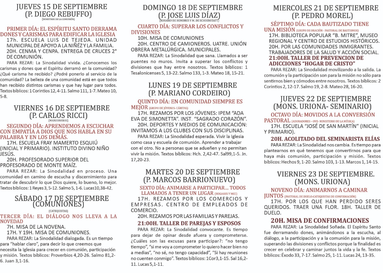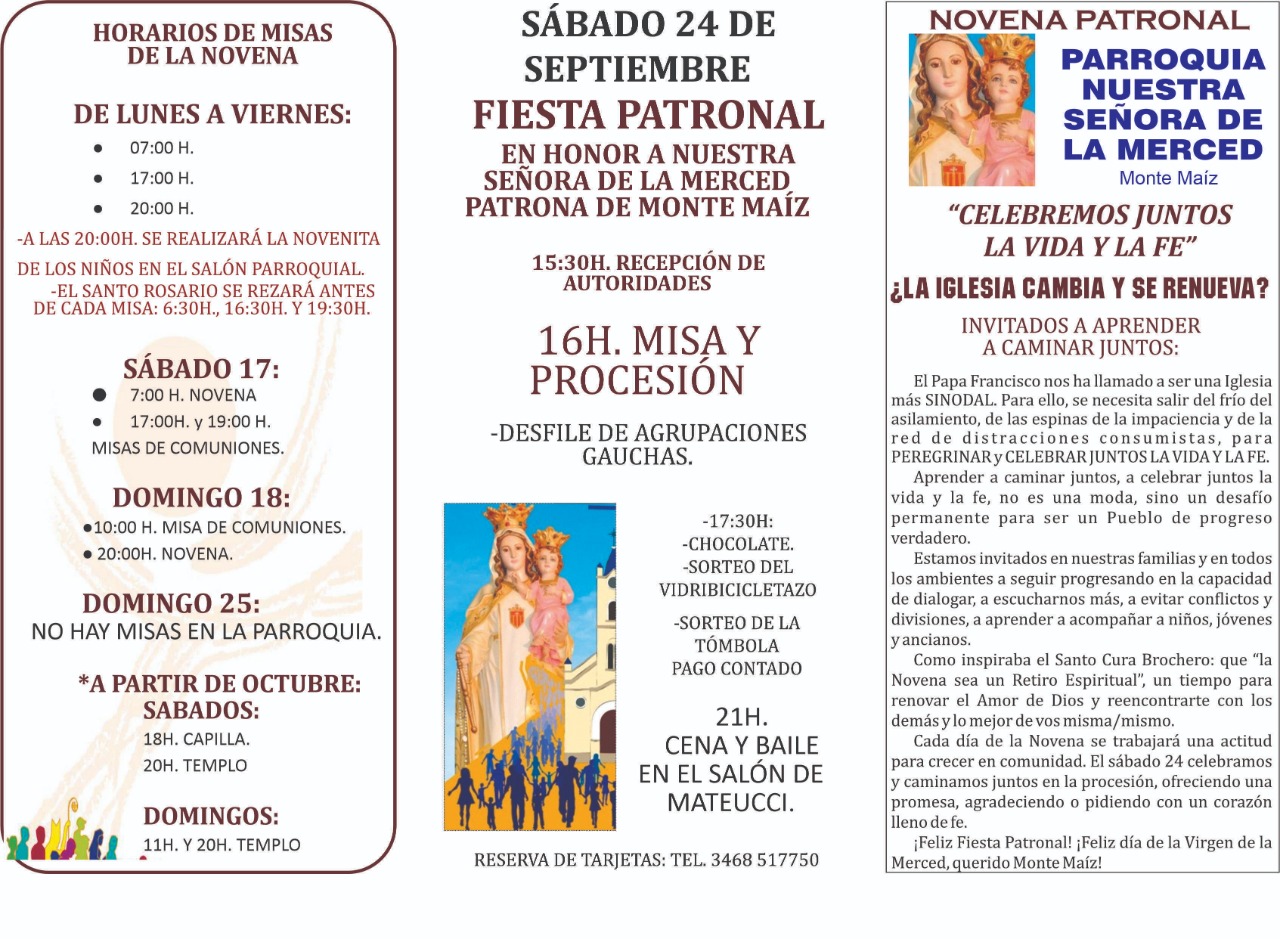 El próximo jueves 15 de setiembre comienza la Novena Patronal en nuestra localidad, bajo el lema "Celbremos juntos la Vida y la Fe", con tres horarios de Misas. Las mismas se celebrarán de lunes a viernes a las 07:00, a las 17:00 y a las 20:00 hs. Media hora de cada Misa se rezará el Santo Rosario; a las 06:30, a las 16:30 y a las 19:30 hs. Y a las 20:00 hs. se celebrará cada día la Novenita de los niños en el salón parroquial.