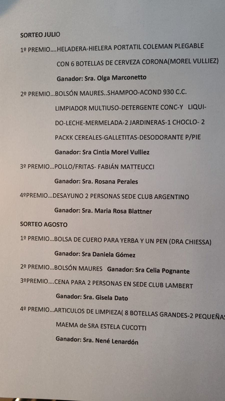 Agradecemos a todos los comercios y particulares que donaron los premios : Morell Vulliez S.A. - Maures Supermercados - Sede Club Deportivo Argentino -  la Sede Club Atlético Lambert - Consultorios Dra Chiessa -Fabián Matteucci - Maema de Estella Cuccoti.