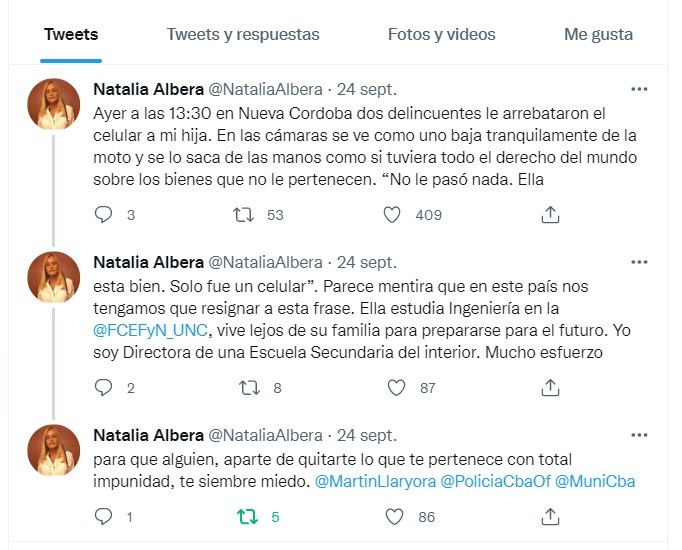 Natalia Álbera, mamá de la joven posense habló en FM de la Medialuna y dijo: “Cuando pasó esto con Catalina, caí en la cuenta de que estamos naturalizando cosas que nos son naturales. Ya sabemos que las cosas materiales se pueden recuperar, pero no por eso tenemos que dejar que esas cosas pasen. Usar el celular en la calle tiene que ser algo normal porque para eso lo tenemos, para comunicarnos. Y tenemos que soportar que con total impunidad te saquen las cosas que son tuyas, sobre todo en Córdoba. Yo hice una publicación en carácter de descargo y mucha gente me escribió. Y me cuentan que a muchos les pasó lo mismo y en el mismo barrio. Y que la ciudad universitaria dejó de ser lo que era antes y hoy es tan inseguro como cualquier otro lugar de Córdoba. La verdad que estas cosas nos siembran una inseguridad increíble en los familiares porque estamos tan lejos de nuestros hijos mientras ellos están estudiando. Insisto, mi preocupación es que estamos naturalizando cosas que no están bien”.