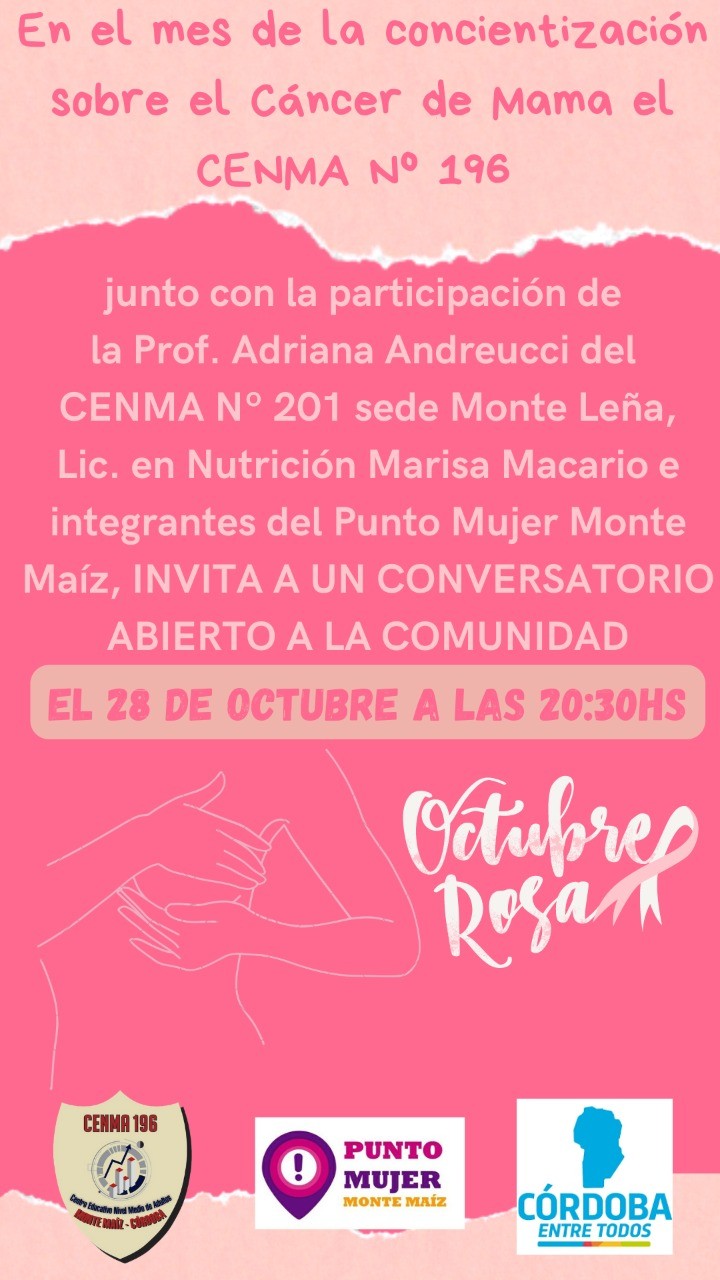 En el mes de la lucha contra el cáncer de mamas, con el objetivo de difundir información sobre la enfermedad y concientizar acerca de su detección precoz, realizaremos un conversatorio abierto a la comunidad en forma conjunta el CENMA N° 196, sedes, anexos, CENMA 201 (sede de Monte leña) y las profesionales del Punto Mujer de la Municipalidad de Monte Maíz. Participarán la Prof. Adriana Andreuchi; lic. en Nutrición Marisa Macario; Psicóloga Yanina Tarántola, Lic. en Trabajo Social Vanesa Maragliano y Rocío Cuciz.