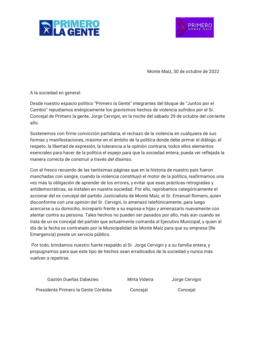 Mediante un comunicado, que aquí citamos la oposición declaró su repudio a un presunto caso de menazas por parte de Emanuel Romero, titular de Re Emergencias.