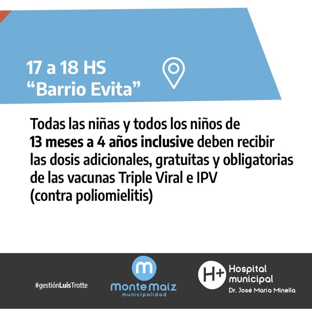 En esta oportunidad, se vacunará este 1° de noviembre en el parquecito de barrio Barracas de 16 a 17 hs.. Y de 17 a 18 hs. se vacunará en B° Evita.