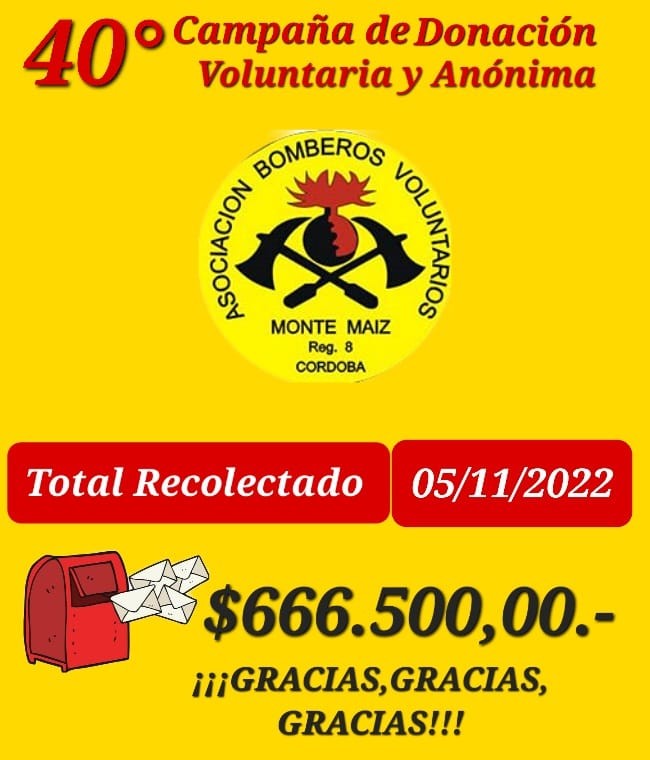 La Asociación Bomberos Voluntarios de Monte Maíz informó anoche que se recaudaron $666.500 en la 40° edición de la campaña del sobre.