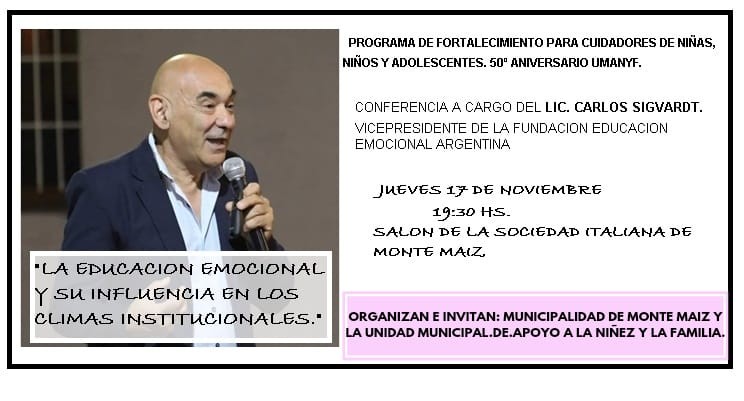 La Unidad Municipal de Apoyo a la Niñez y la Familia y el Centro de Desarrollo Infantil Huellitas, invitan a la conferencia a cargo del Lic. Carlos Sigvardt, Vicepresidente de la Fundación de Educación Emocional Argentina.