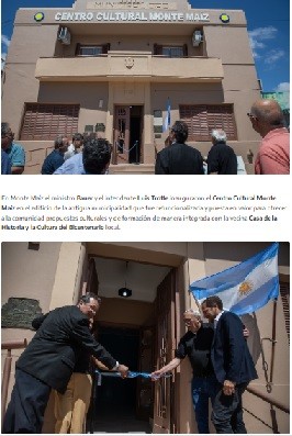 “En Monte Maíz el ministro Bauer y el intendente Luis Trotte inauguraron el Centro Cultural Monte Maíz en el edificio de la antigua municipalidad que fue refuncionalizada y puesta en valor para ofrecer a la comunidad propuestas culturales y de formación de manera integrada con la vecina Casa de la Historia y la Cultura del Bicentenario local”.