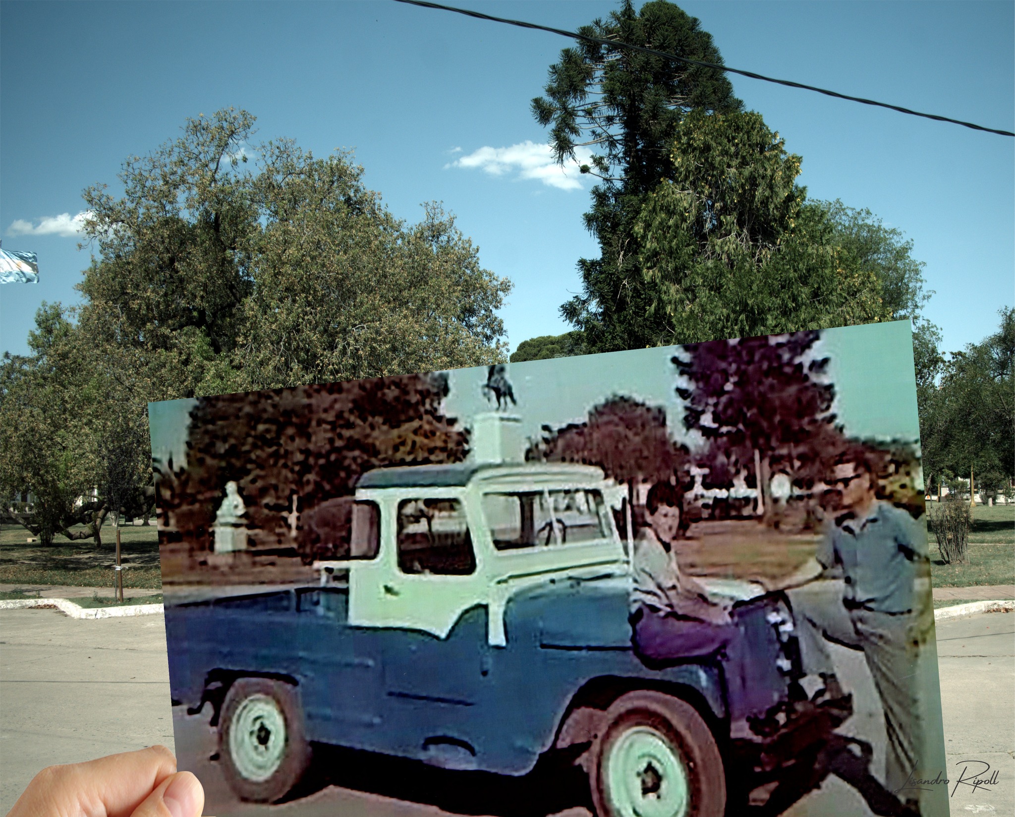 El autor del trabajo expresó en declaraciones periodísticas: “Surgió de una idea media loca pero más que nada de la curiosidad de saber como era Monte Maíz antes, comparándolo con la actualidad. Así fue como se me ocurrió hacer coincidir fotos antiguas de distintos lugares con la imagen de ahora. La verdad que la idea fue mostrar cualquier lugar del pueblo sin detenerse solamente en lugares icónicos de Monte Maíz. Fui probando y de a poco se fue plasmando la idea. La verdad es que antes de hacer el trabajo busqué por internet algunas opciones o referencias y encontré que en países europeos, como por ejemplo en Francia, se hicieron trabaos de estas características. Y eso me ayudó mucho en la idea inicial. Y están en exposición en el centro Cultural porque mientras yo estaba realizando este trabajo estaba haciendo algunos trabajitos para Cultura. Se me ocurrió preguntar si iban a exponer algo para la inauguración y les pregunté si les interesaba lo que estaba haciendo yo y de inmediato se aceptó mi propuesta. Por el momento, y creo que de manera permanente se puede visitar la muestra en ese lugar”.