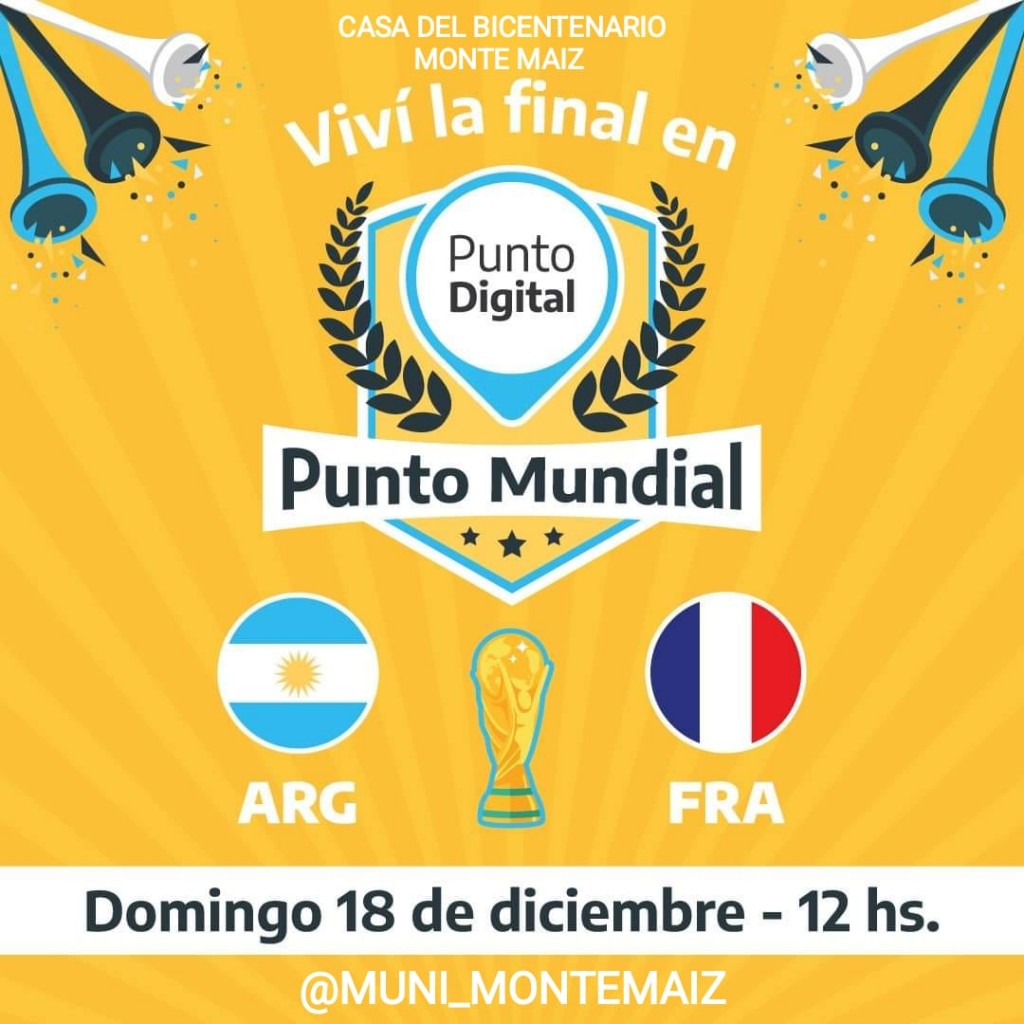 Mañana te esperamos desde las 11 hs. a palpitar la previa y mirar la final de la De la copa del mundo Qatar 2022 . Alentamos a nuestra selección desde la Casa del Bicentenario con pantalla gigante. Habrá buffet!! AGUANTE NUESTRA SELECCIÓN ARGENTINA.