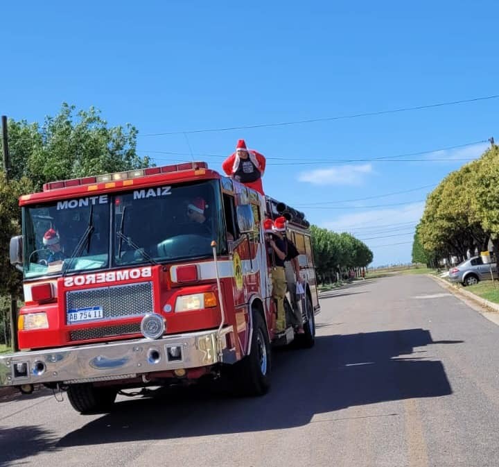 Este sábado por la tarde, Papá Noel recorrió las calles de Colonia Bismarck en una de las unidades de Bomberos Voluntarios de Monte Maíz.