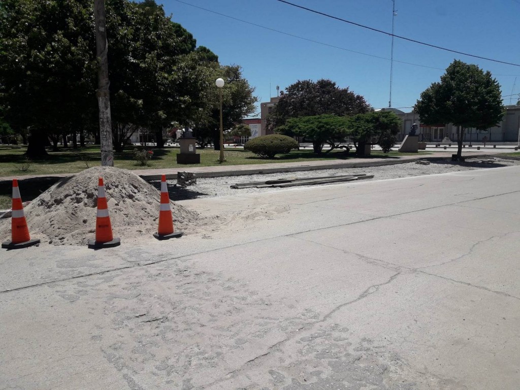 Personal de Obras Públicas de la Municipalidad de Monte Maíz está trabajando en calle 9 de Julio y esquina San Martín en la construcción de dársenas de estacionamiento, en plaza José de San Martín.