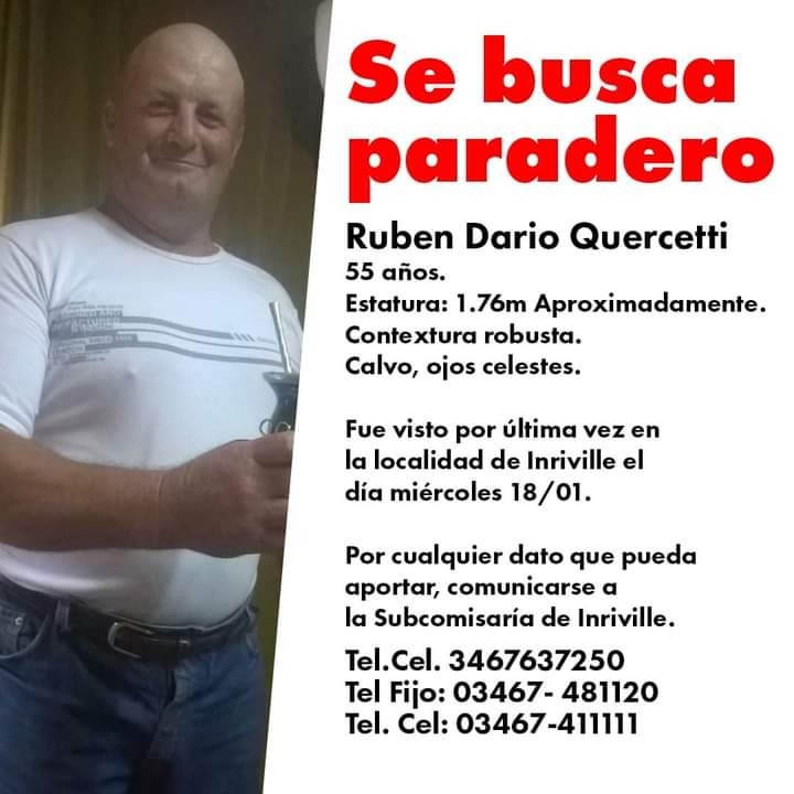 Desde la localidad de Inriville se solicita paradero de Rubén Darío Quercetti de 55 años de edad, quien hace más de 5 días que no se sabe nada de él.
