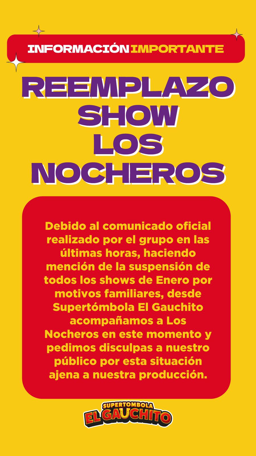 Acompañamos a los amigos de Los Nocheros en este momento difícil y comunicamos el reemplazo de su show en nuestra Gran Noche Final del próximo Sábado 28 de Enero.