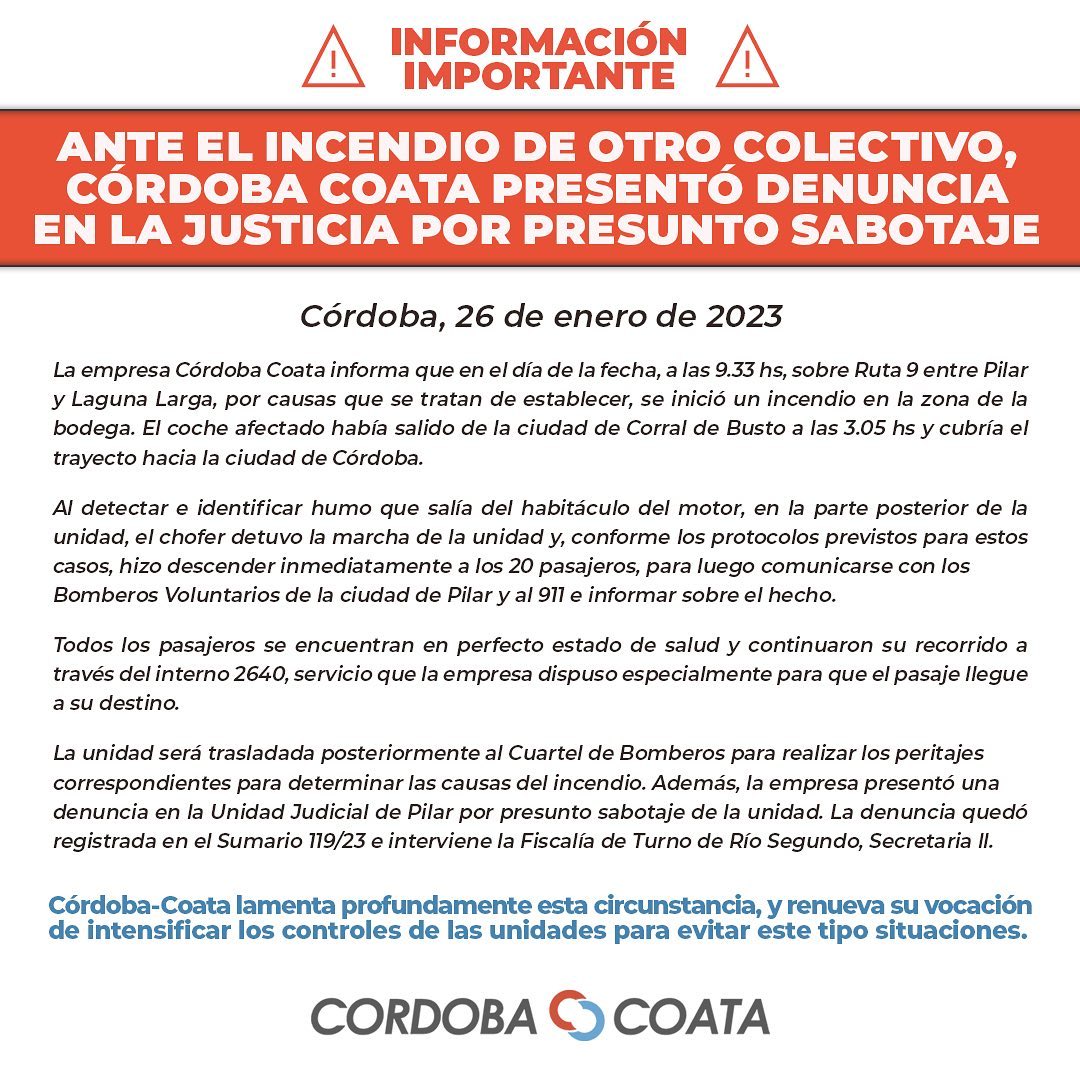 Tras el incendio del colectivo entre Pilar y Laguna Larga, la empresa Coata Córdoba, denunció sabotaje en sus unidades. Entre 2022 y lo que va de 2023 son 9 casos de incendios de sus colectivos en distintas rutas de la provincia.