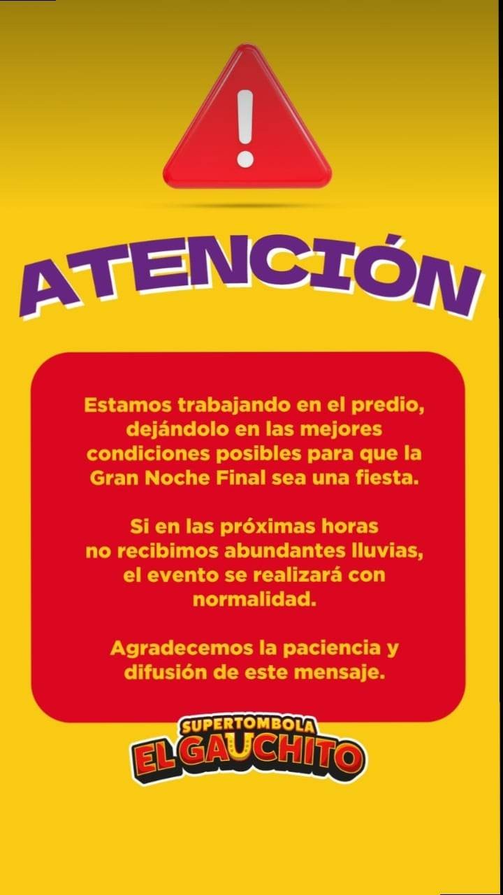 Según se informó desde la organización de la Súper Tómbola El Gauchito, el evento sigue en pie pese a la lluvia caída en el día de hoy. Personal del evento se encuentra trabajando en el predio para dejarlo en condiciones y que el evento se desarrolle con normalidad.