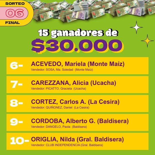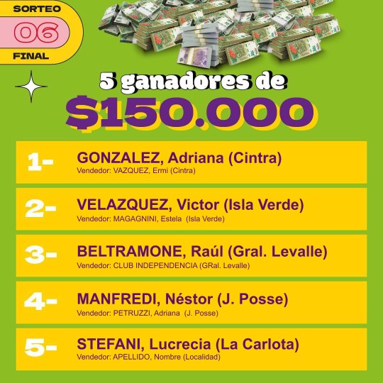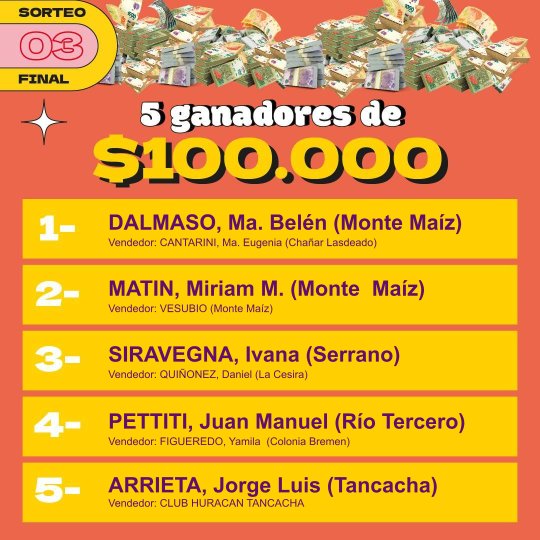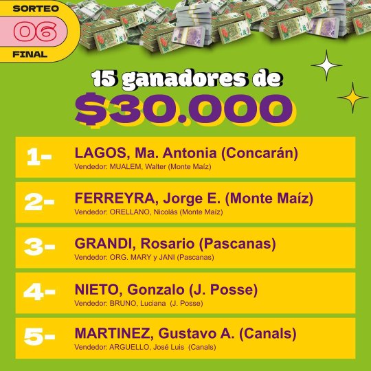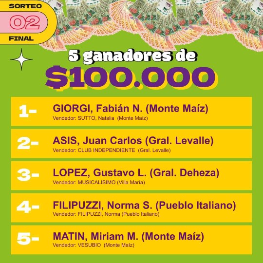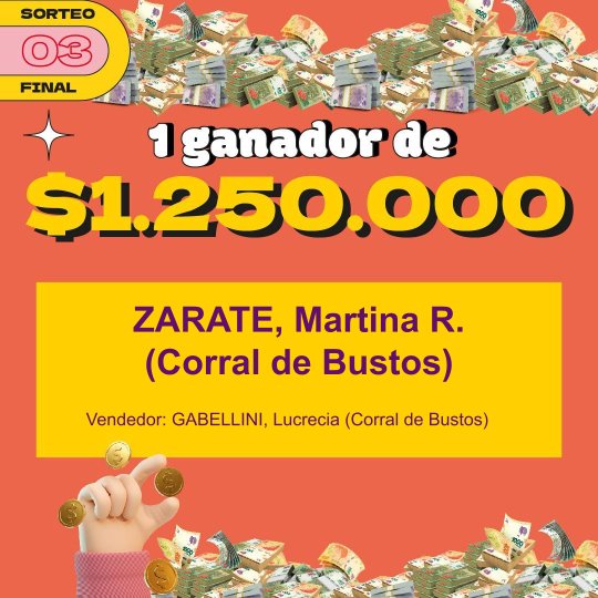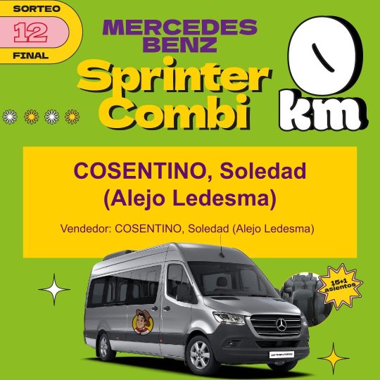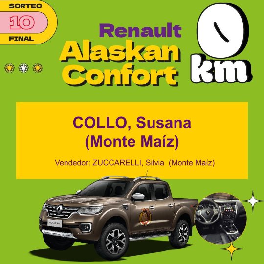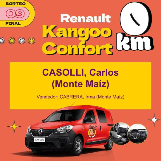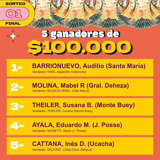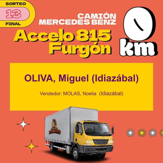Entre los premios más importantes hubo una vivienda, cuyo ganador fue la empresa Vesubio de Monte Maíz. Una Mercedes Benz, Sprimter Combi, que ganó Soledad Cosentino de Alejo Ledesma. El camión Mercedes Benz, Accelo 815 fue para Miguel Oliva de idiazábal y el departamento a estrenar en la ciudad de Córdoba fue para Pablo Arrigoni de Cipolletti, provincia de río Negro.