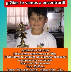 En tanto, conocidos, familiares y amigos de la familia están convocando a una caminata para este lunes 30 de enero a las 20:30 hs. que partirá desde la plaza San Martín para pedir por la aparición y devolución del niño a la guarda de su abuelo, Ricardo Zapata.