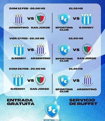 La jornada inicial tendrá lugar mañana domingo 12 de febrero. En el primer turno, desde las 20:00 horas, el Raya de Cristian Dragonetti enfrenta a San Jorge. Midiéndose desde las 21:30, el local Sporting con el Albiceleste que dirige Gustavo Vanerio.