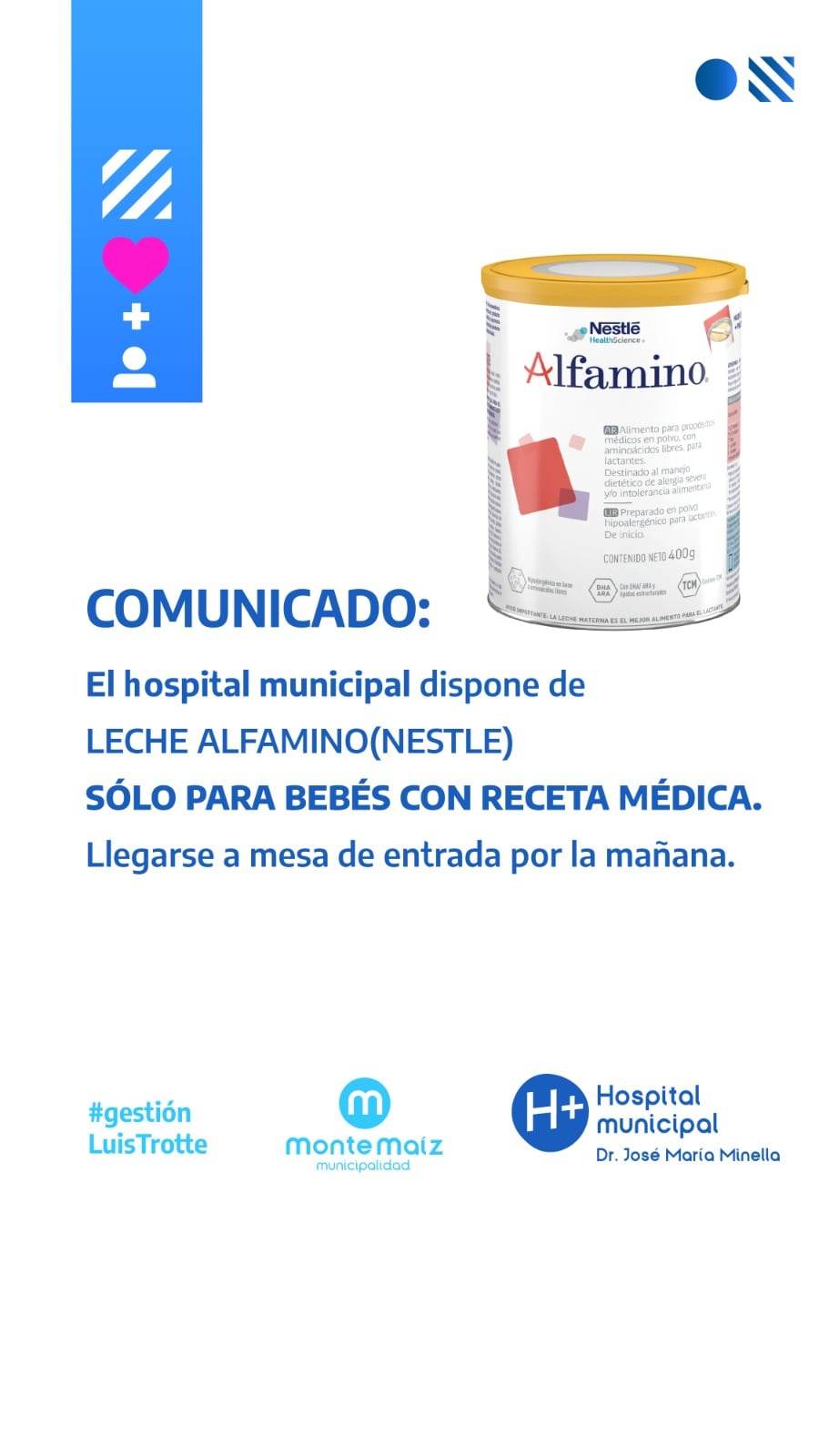 El Hospital Municipal, Dr. José María Minella, informa a la población que cuenta con leche Famino (Nestlé), solo para bebés con receta médica.