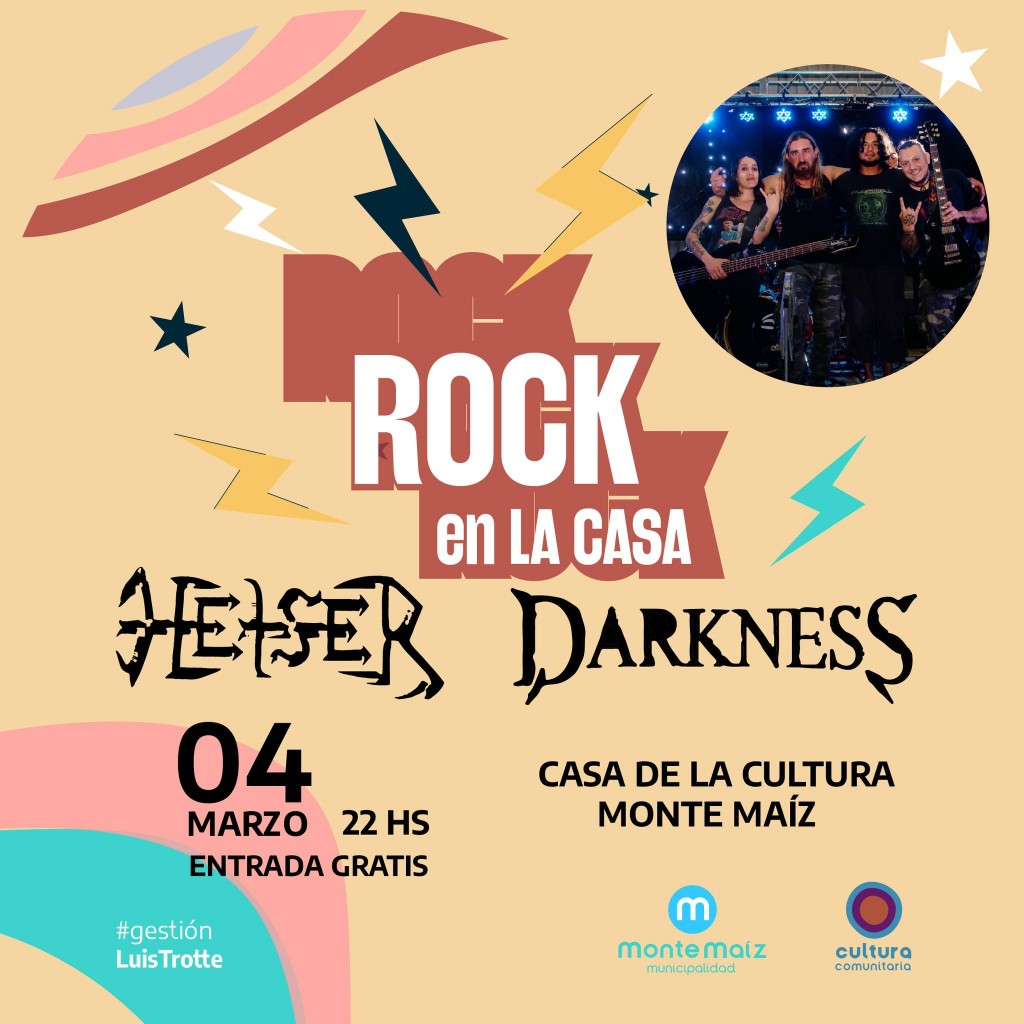 Este sábado por la noche, desde las 22 hs. tendrá lugar el evento musical “Rock en la Casa”, frente a la Casa de la Cultura de nuestra localidad con la actuación de la Banda local Heiser y Darkness de la ciudad de Corral de Bustos Ifflinger.