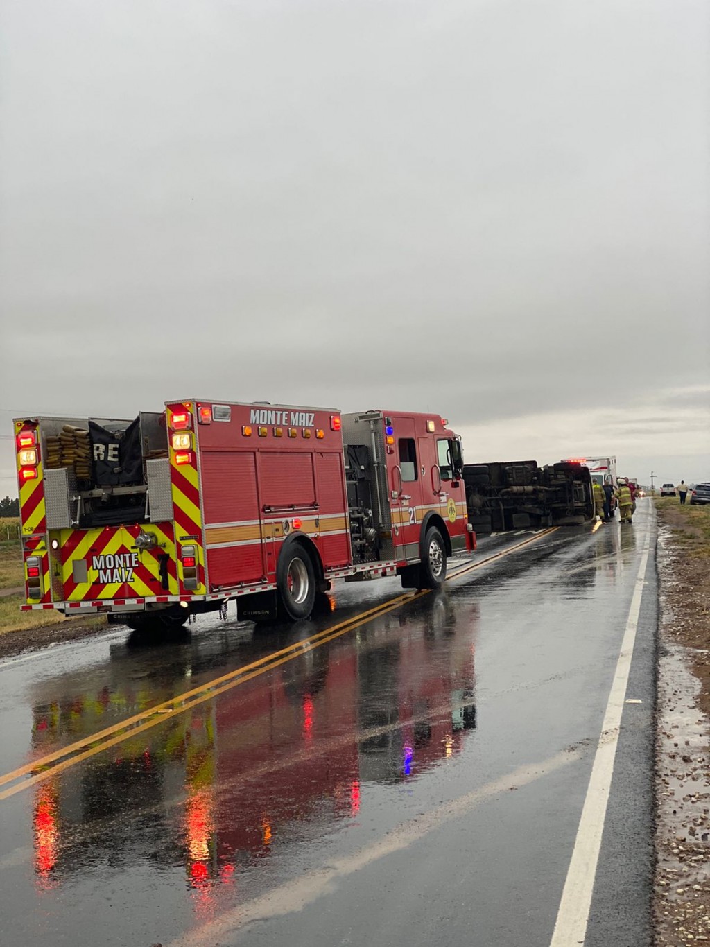 En horas de la mañana de este martes, Bomberos Voluntarios de Monte Maíz, debieron intervenir en ruta provincial N° 11 a unos mil metros del puente del Río Saladillo, hacia el cardinal oeste, con sentido hacia Wenceslao Escalante por el vuelco de un camión térmico que transportaba carne.