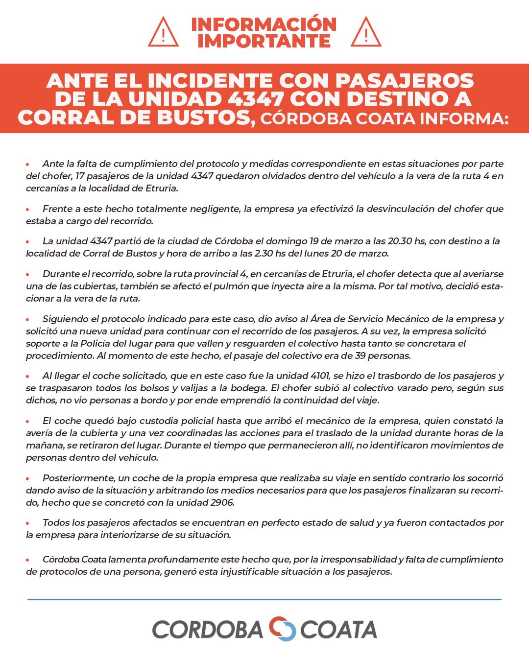 La joven manifestó que todo se resolvió gracias a dicho chófer y su acompañante: “Ellos seguían hasta Villa María y uno pegaba la vuelta con un micro para dejarnos en destino. El colectivo terminó llegando 8.40 su recorrido final”
