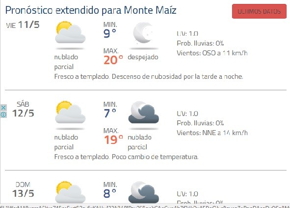 Luego de varios días con lluvia y más de 100 mms. caídos en Monte Maíz comienza a mejorar el clima. Ya desde el jueves por la noche pasadas las 22:00 hs. dejó de llover y, según la Página del tiempo “Infoclima”, habrá una mejoría hasta el próximo jueves 17 de mayo.