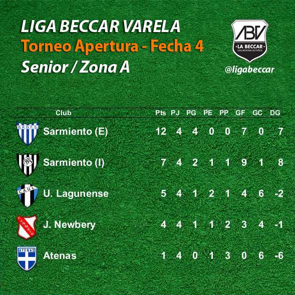 Resultados, autores de goles e incidencias de la 4ta fecha del Torneo Apertura “Luis Alberto Porporato” de categoría Senior de la Liga Beccar Varela. La programación se disputó en la noche del viernes 31 de marzo, en canchas de Jorge Newbery (Ucacha), Sportivo Chazón (Chazón) y Sarmiento (Etruria).