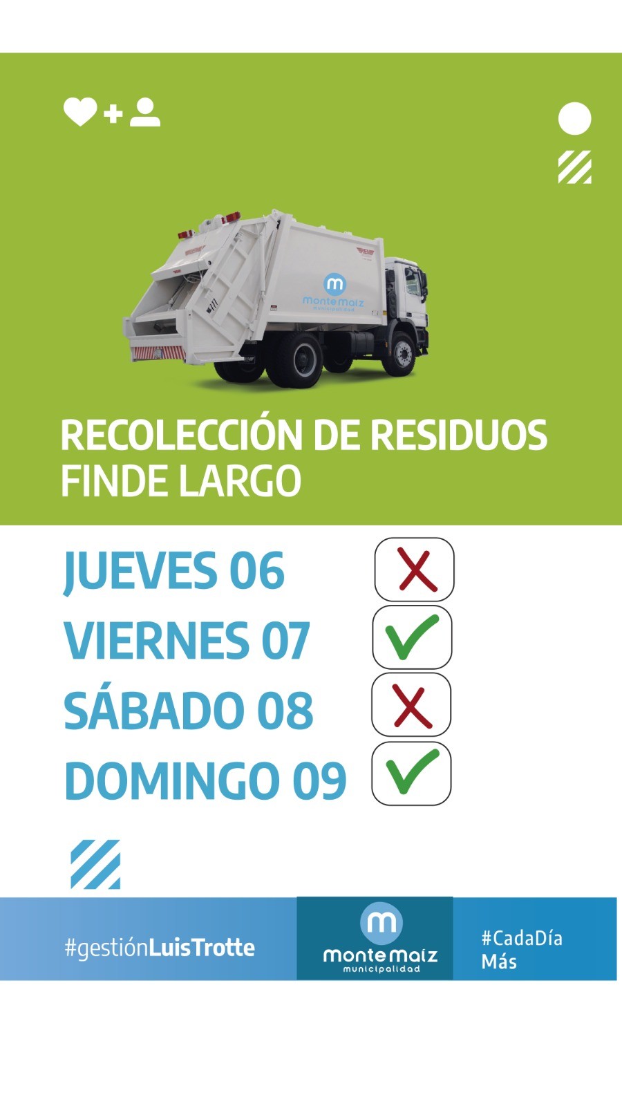 La Municipalidad de Monte Maíz informa a la población que la recolección de residuos será normal este viernes 7 y domingo 9 de abril. En tanto, no habrá recolección ni jueves 6 ni el sábado 8 de abril. El cronograma responde a la festividad de Pascuas.