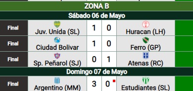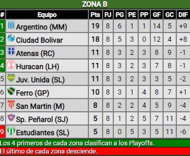 De esta manera, Argentino de Monte Maíz finalizó puntero de la Zona “B”, con 19 puntos, en esta primera rueda; seguido de Ciudad Bolívar con 18 unidades.