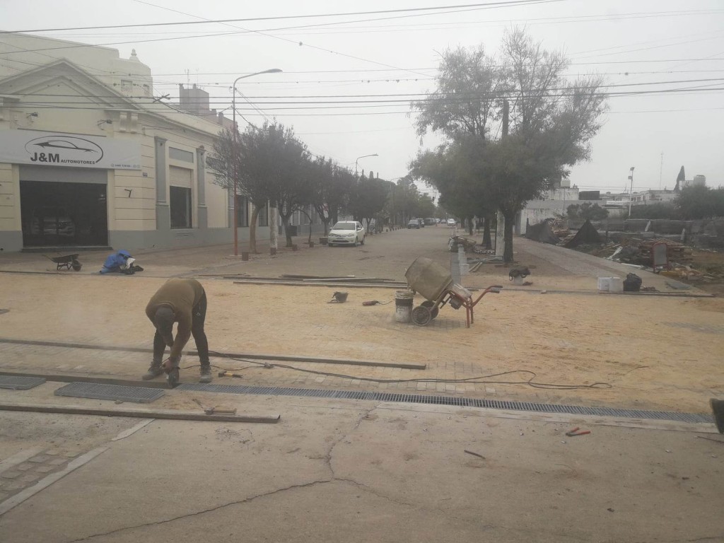 Personal abocado a los trabajos de la colocación de adoquines en las calles de tránsito restringido finalizó con la primera cuadra. Los adoquines llegan hasta el cordón del paseo de la Hermandad con el objeto de que dicho alteo, producto de la colocación de adoquines, hagas las veces de un reductor de velocidad, teniendo en cuenta que está en el límite con el parquecito.