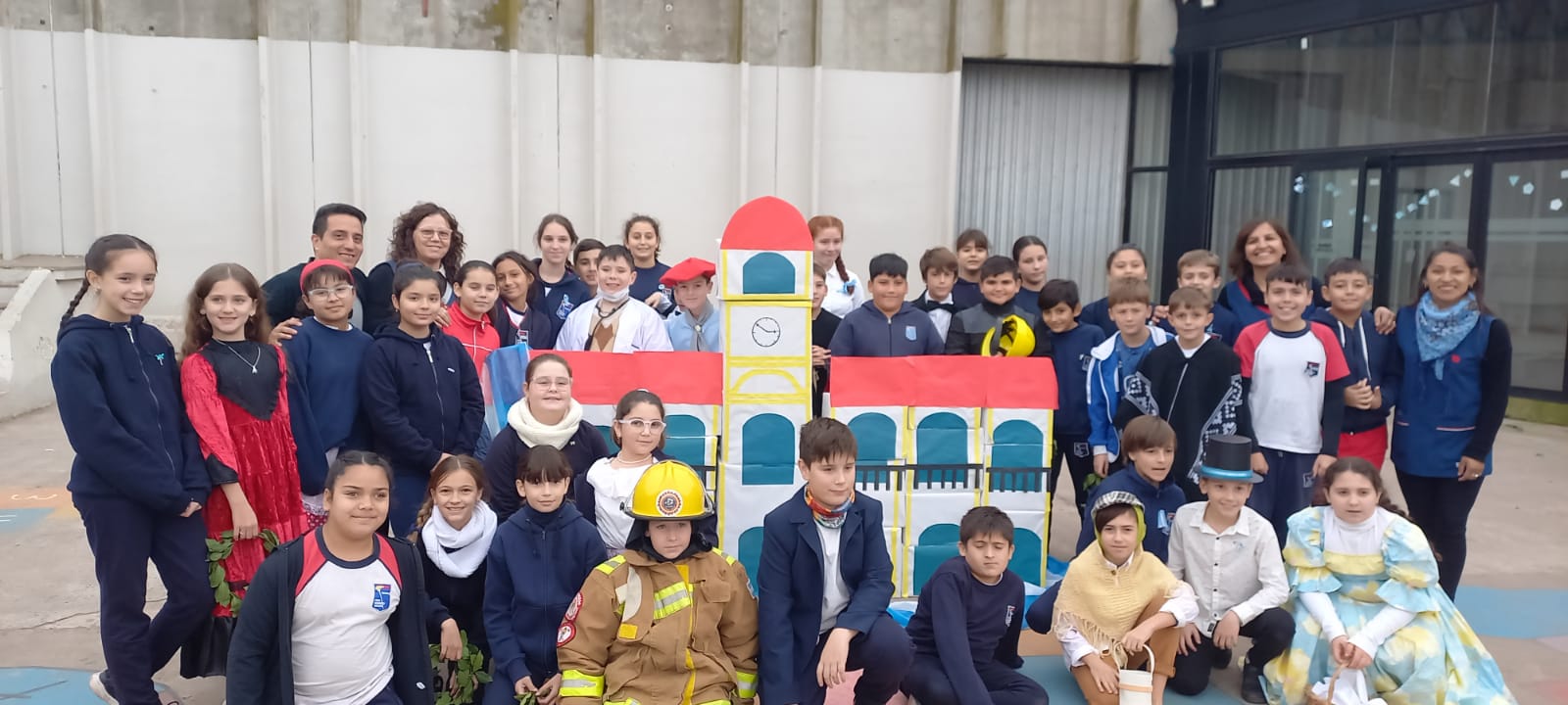 Se hizo una representación artística alusiva a la construcción del Cabildo en una clara metáfora a lo que significó la fecha para todos nosotros. Nada más ni nada menos que fue la construcción de la patria, surgiendo a partir de un primer gobierno propio. La representación fue acompañada por un audio relativo a la ocasión, grabado por padres de los alumnos.