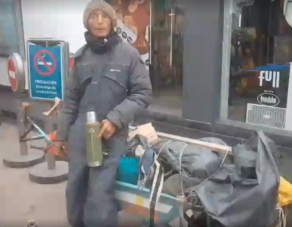 En su carretilla lleva ropa de abrigo y elementos para pasar la noche. Dijo que está abrigado y que tiene ropa térmica e impermeable Rescató la presencia policial en las rutas de Santa Fe y dijo que no sabe cuando va a llegar aunque estima que para el mes de agosto podríaa llegar a destino. La vuelta sería a dedo.