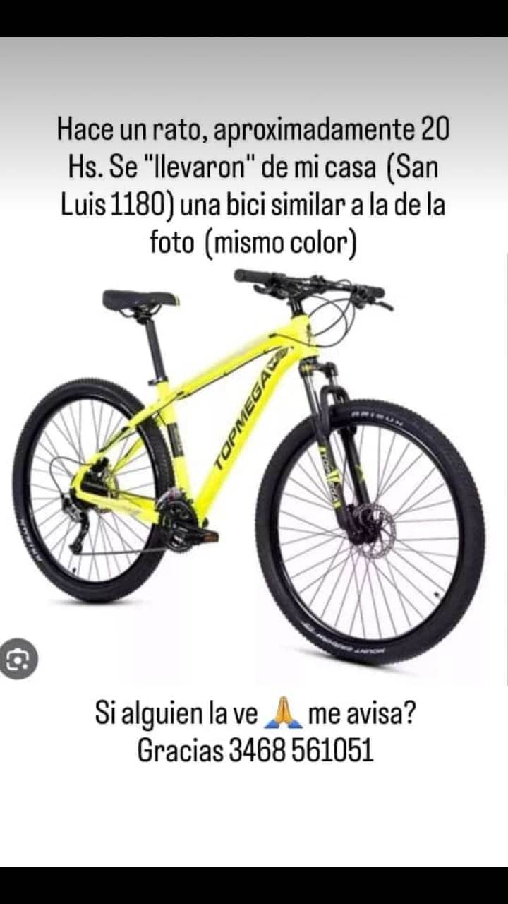Una bicicleta Mountain Bike, rodado 29, amarillo flúo, fue robada este miércoles a la tardecita, 20 hs. aproximadamente, cuando el propietario de la misma la dejo apoyada en el pilar de su vivienda ya que iba a salir rápido de la misma para volver a usarla y en el término de cinco minutos la bicicleta desapareció.