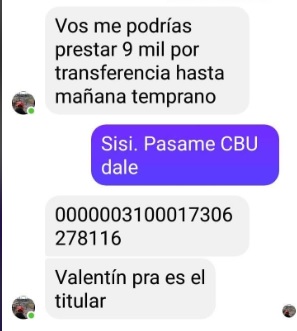 Los mismos decían si lo podían ayudar que necesitaba un favor. Cuando alguien se hacía eco del mensaje de inmediato les pedía que le prestara $9.000 por transferencia con la promesa de que al otro día se hacia la devolución a primera hora.