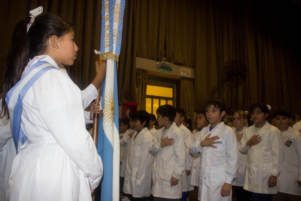 En el comienzo del acto, el locutor oficial, Iván Ghi, invitó a abanderado y escoltas a ubicarse en el salón; se entonaron las estrofas del Himno Nacional Argentino y se hizo un minuto de silencio en homenaje a Manuel Belgrano a 203 años de su fallecimiento.