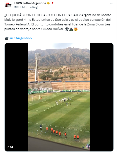 “¿TE QUEDÁS CON EL GOLAZO O CON EL PAISAJE? Argentino de Monte Maíz le ganó 4-1 a Estudiantes de San Luis y es el equipo sensación del Torneo Federal A. El contunto cordobés es el líder de la Zona B con tres puntos de ventaja sobre Ciudad Bolívar”.