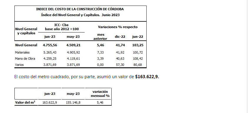 Durante el mes de junio de 2023, el Índice del Costo de la Construcción de Córdoba (ICC- Cba) registró una variación mensual del 5,46% en su Nivel General y del 103,25% en relación a junio de 2022.
