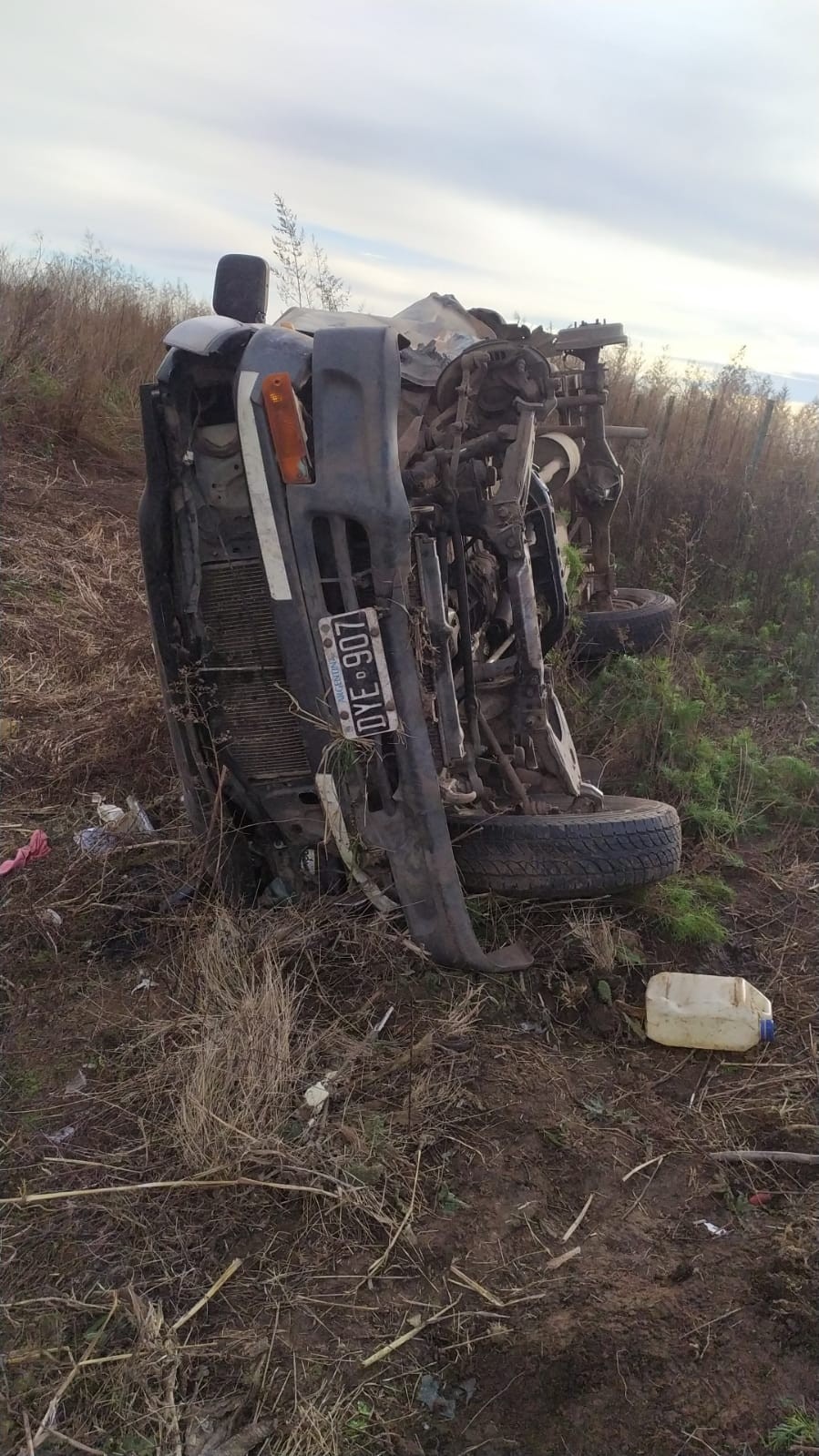 Al tomar por este camino alternativo, hacia Venado Tuerto, embistió una camioneta Toyota y ambos vehículos terminaron volcando al costado de un camino en un zanjón.