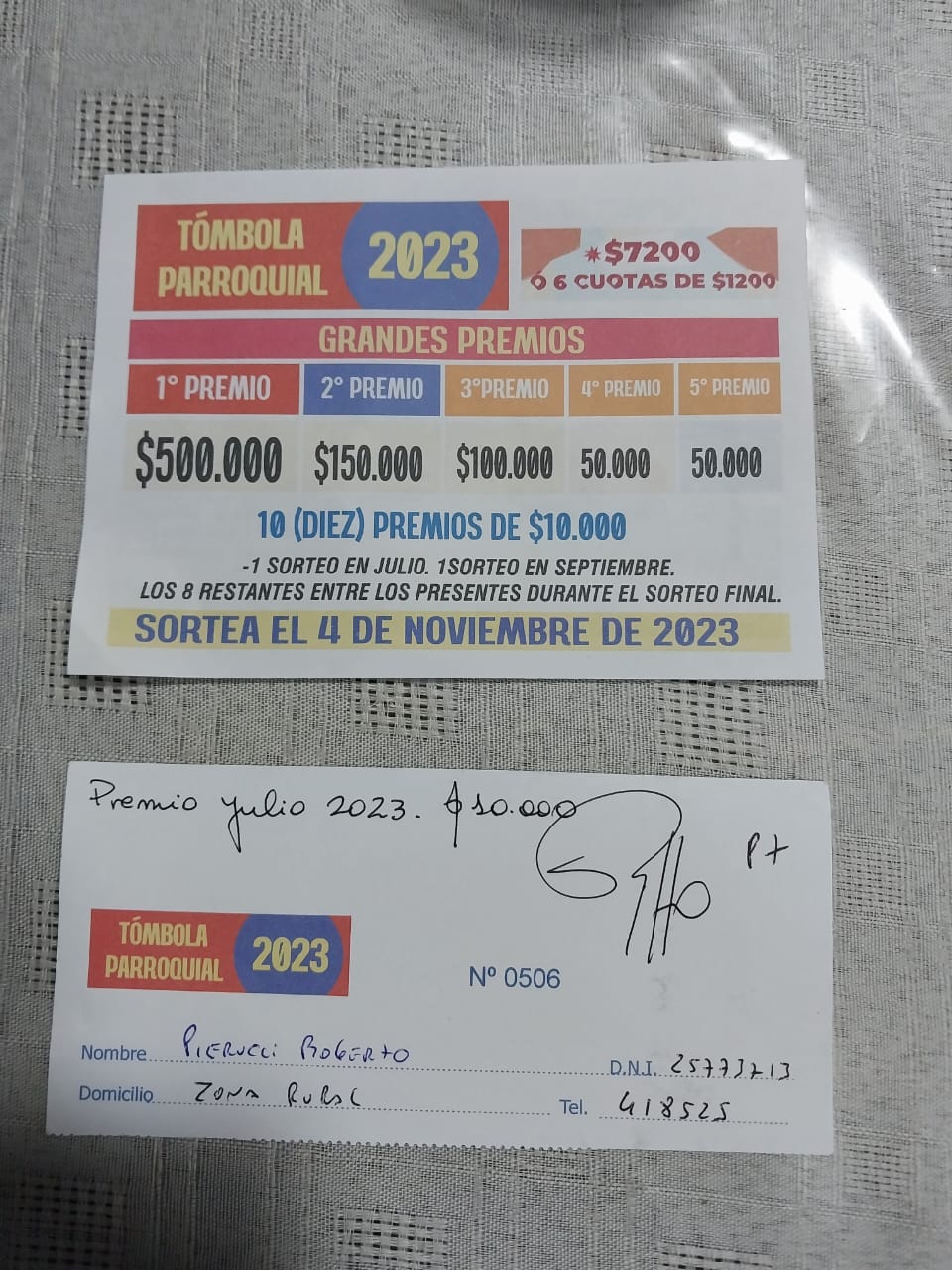 El Ganador fue Roberto Pierucci de zona rural de Monte Maíz con el número 0506. El sorteo corresponde al mes de julio de 2023 y se hizo por extracción de cupón.