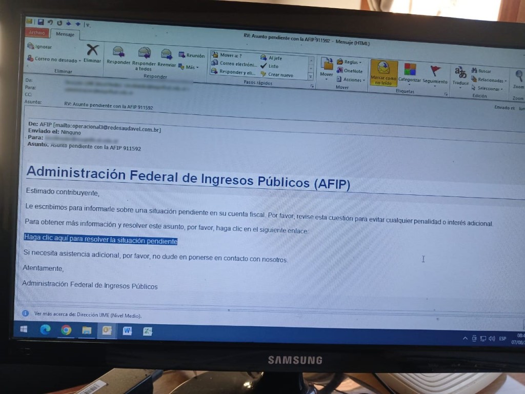 Desde la institución se comunicaron con la delegación local de AFIP y le informaron que dicho mail no se emitió desde la base de dato del organismo y que por ende es "TRUCHO", es decir una supuesta maniobra de delincuentes informáticos para poder ingresar a la base de datos de clientes y concretar estafas.