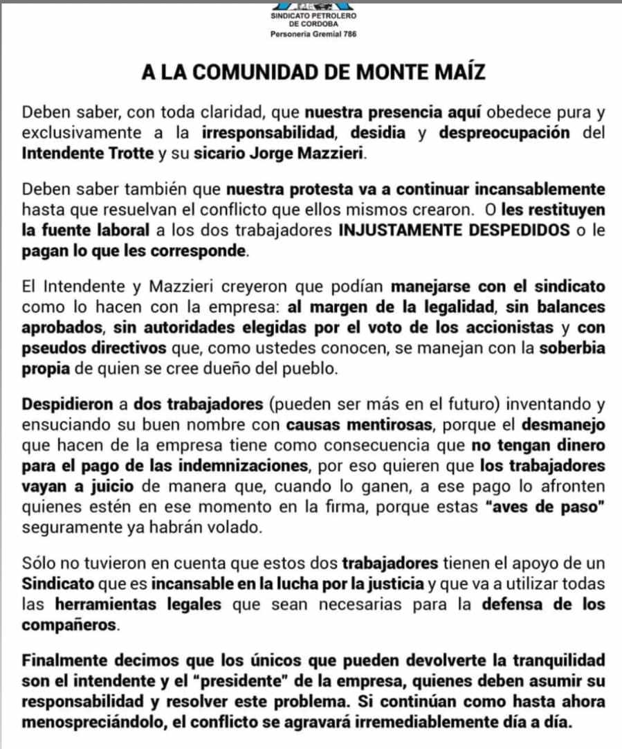 El Sindicato de Petroleros de Córdoba habría emitido un comunicado responsabilizando al Intendente Luis Trotte y al Ing. Jorge Mazzieri, Presidente del Directorio de Gas de Monte Maíz S.A. por el conflicto surgido del despido de Lisandro Alaníz y Daniel Gentile.