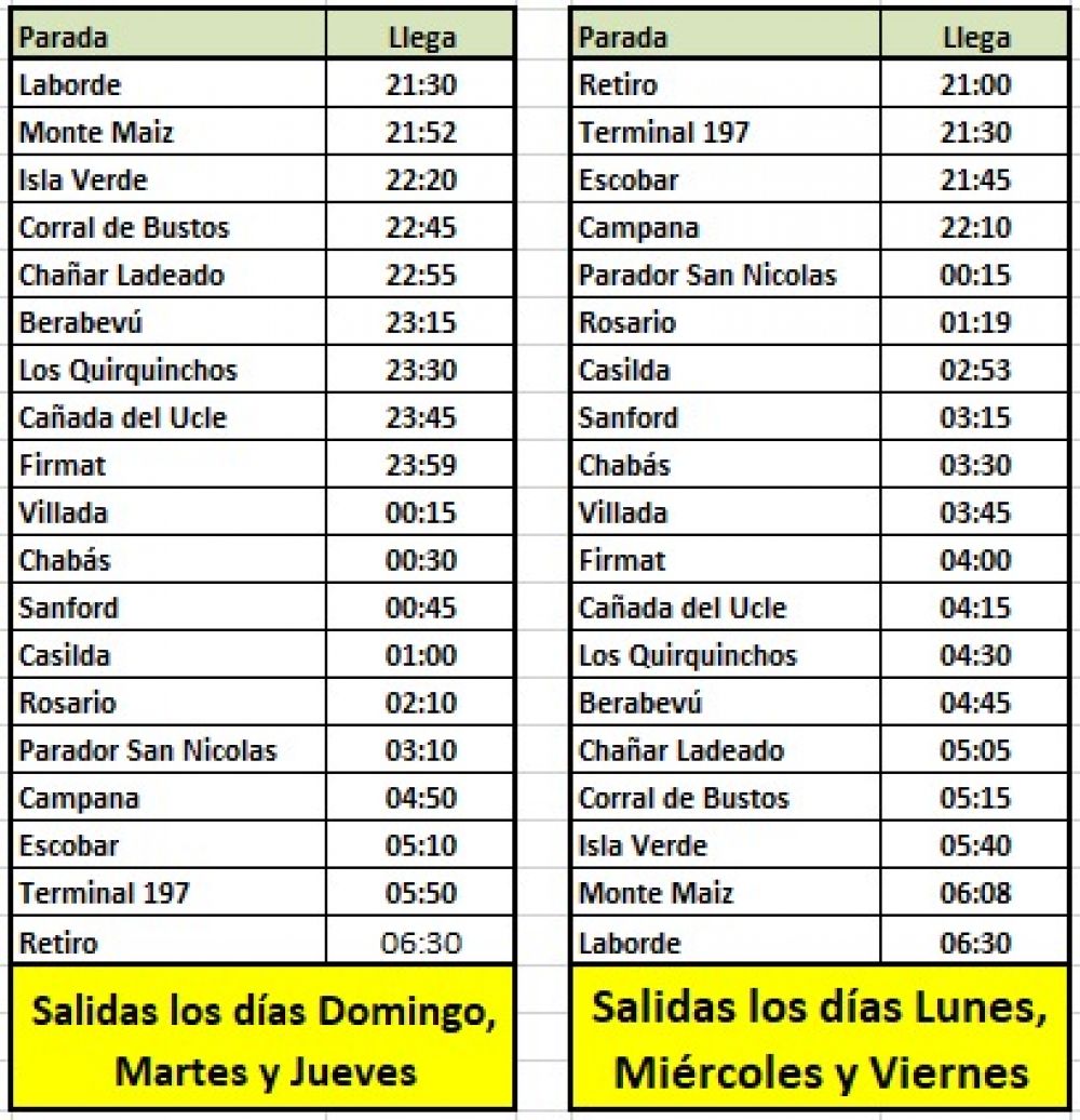 Laborde/ Retiro: $18.600 para asinto coche cama - Asiento coche semicama: $14.400.