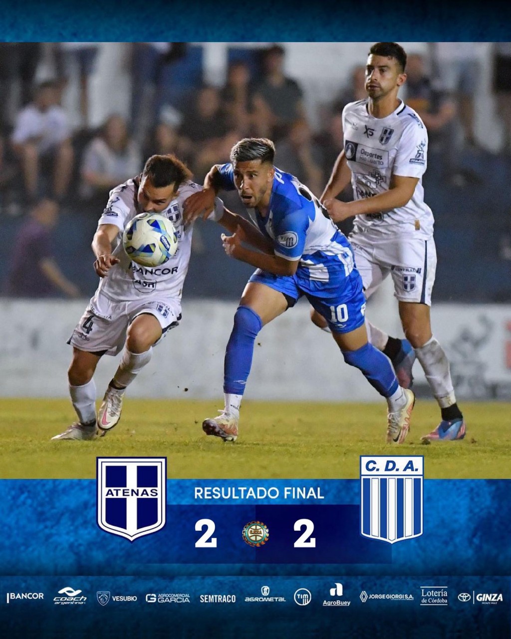Argentino empatóen Río Cuarto frente a Atenas por 2 a 2 en un vibrante partido en el que finalmente el Raya de Monte Maíz consiguió la clasificación a la Copa Argentina 2024.