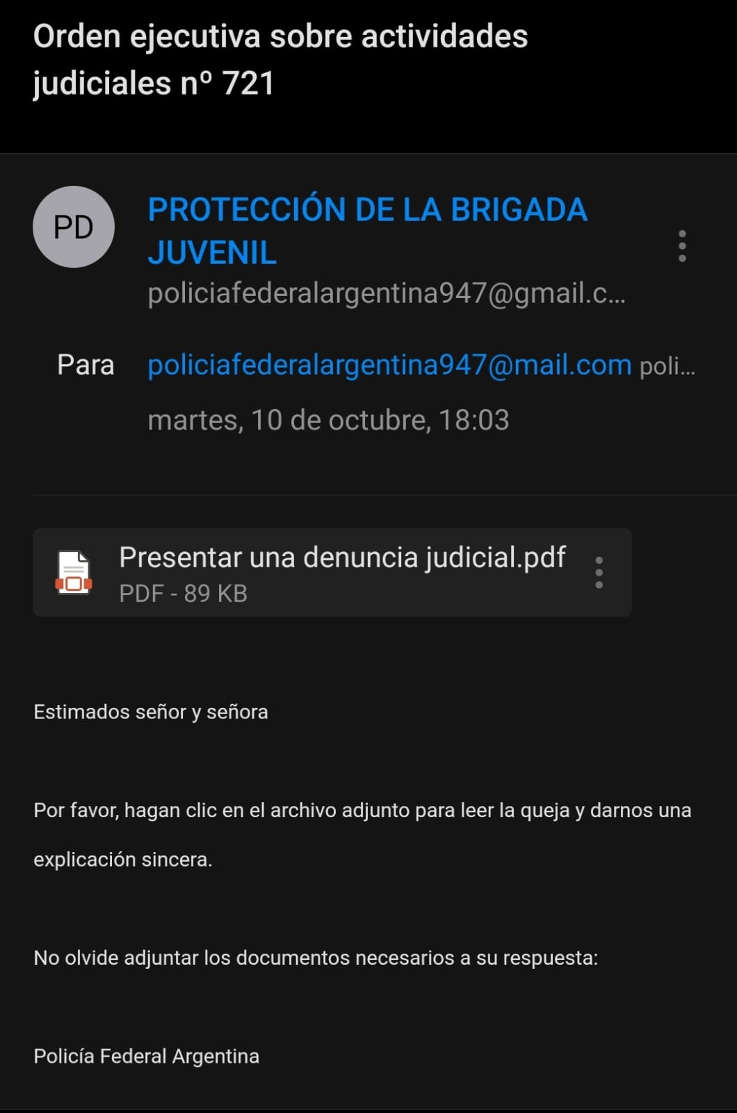 Desde la Comisaría de Monte Maíz se informó que en la tarde del martes, muchos vecinos recibieron correos electrónicos en nombre de Protección de la Brigada Juvenil de la Policía Federal Argentina. Los mismo son apócrifos.