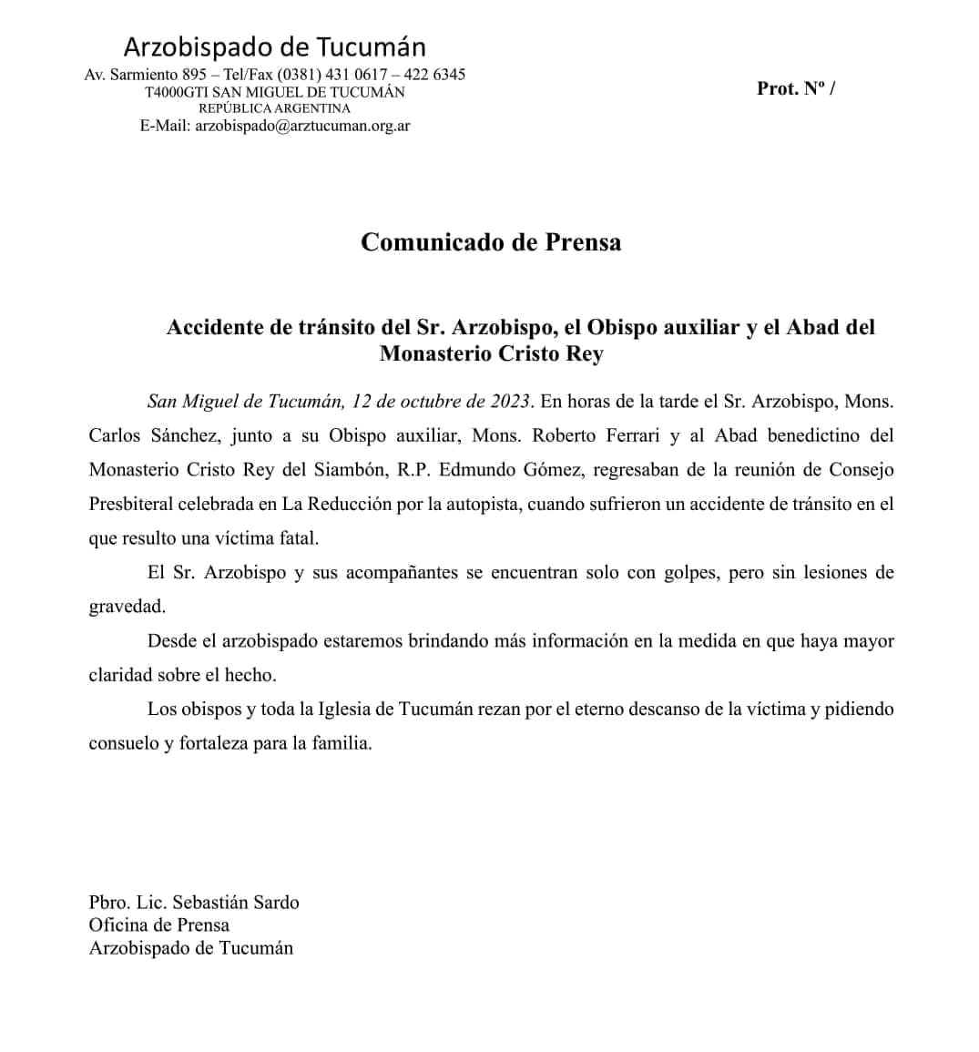 (Jueves 12 de octubre de 2023) El Obispo Auxiliar de Tucumán, el ucachense Roberto Ferrari; junto al Arzobispo Carlos Sanchez y otro religioso sufrieron un accidente de tránsito donde falleció una persona que se trasladaba en otro auto involucrado. Los religiosos resultaron con distintos golpes pero están fuera de peligro. /