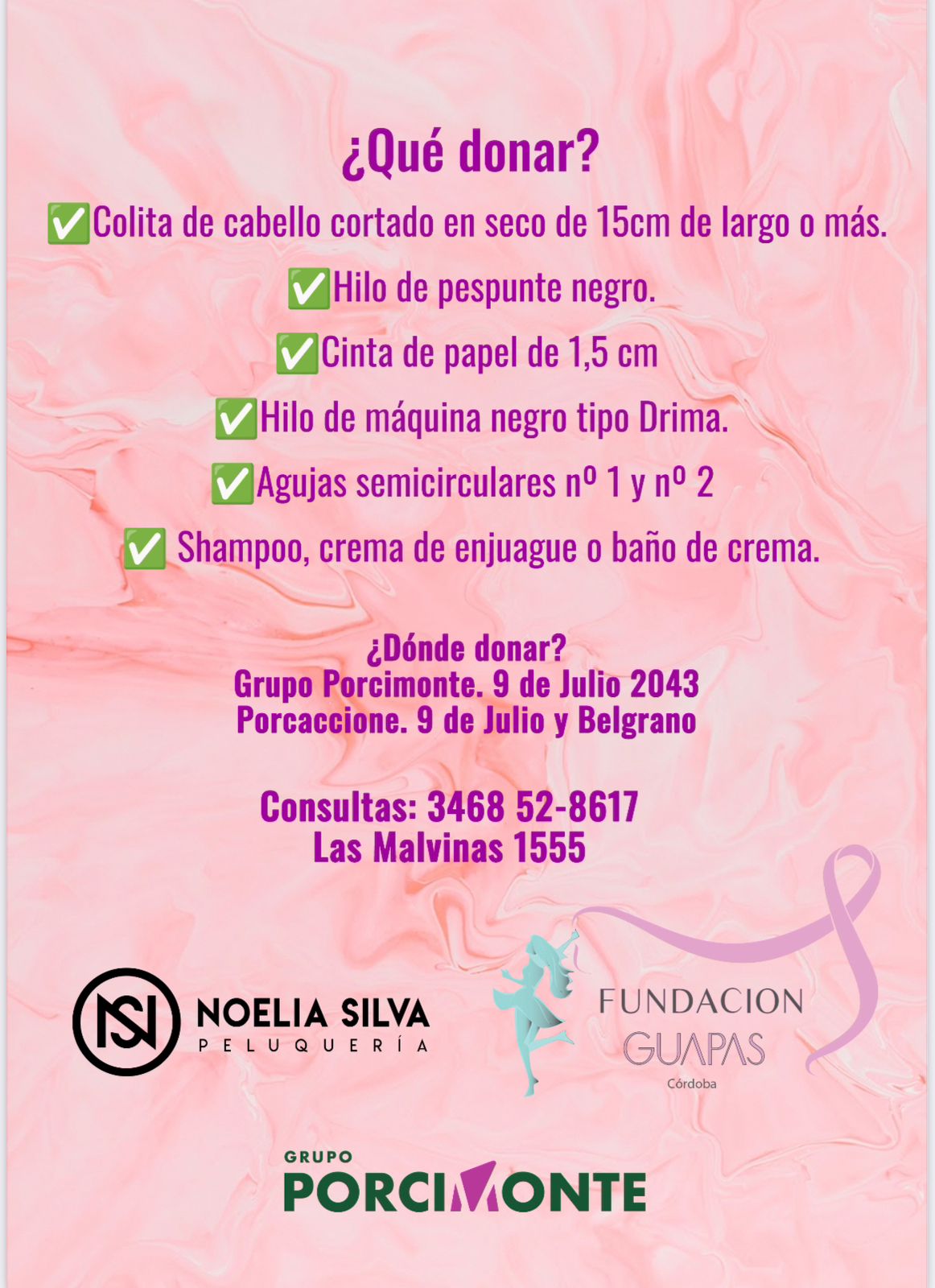 Las donaciones se pueden hacer en las oficinas de Porcimonte, calle 9 de Julio 2043 o en Porcaccione, calles 9 El Grupo Porcimonte organizó una importante movida solidaria de donación de cabello para la Fundación de Julio, esquina Belgrano.