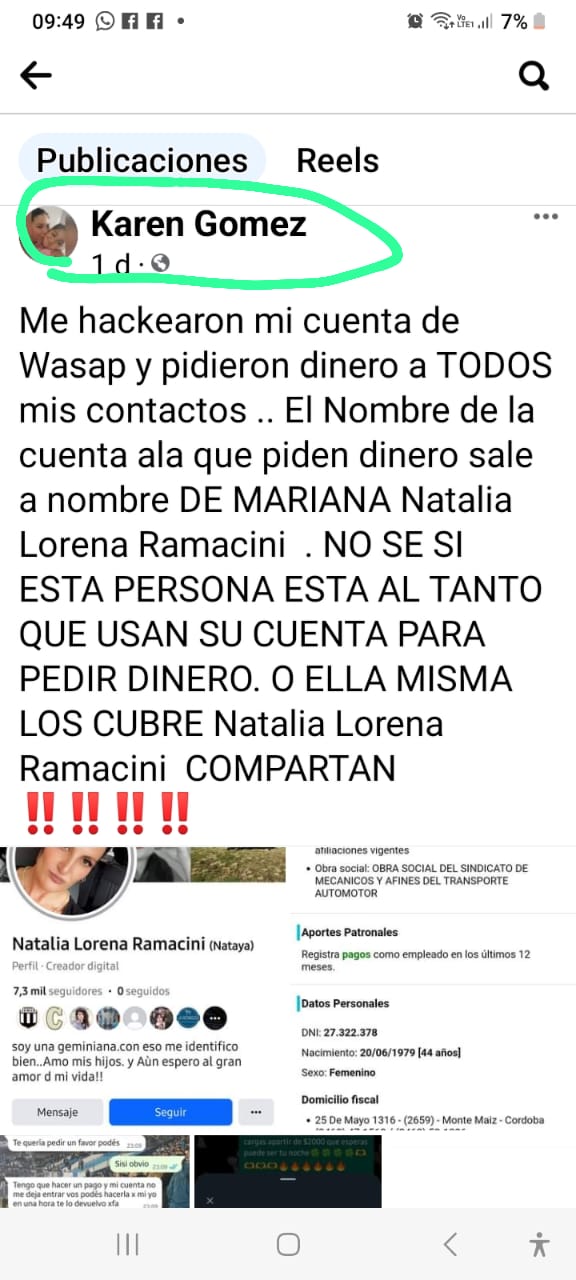 De inmediato, avisó a través de su cuenta de facebbok que le estaban jugando una mala pasada y difundió una captura en donde se veía el número de teléfono desde donde se había iniciado la conversación; el mismo tenía característica de Buenos Aires. Eso ayudó a defenderse ya que, según contó a este Medio la damnificada, siempre tuvo el mismo número y con la característica de nuestra localidad: "hace quince años que tengo el mismo número", manifestó. De allí dedujo que no le habían hackeado el whatsapp pero, sin embargo, los estafadores habían accedido a sus datos personales.
